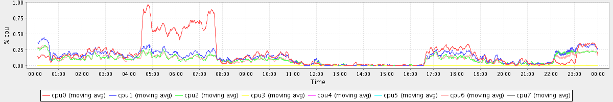 avg(cpu0) = 2.18 avg(cpu1) = 0.91 avg(cpu2) = 0.73 avg(cpu3) = 0.42 avg(cpu4) = 0.36 avg(cpu5) = 0.37 avg(cpu6) = 0.71 avg(cpu7) = 0.43