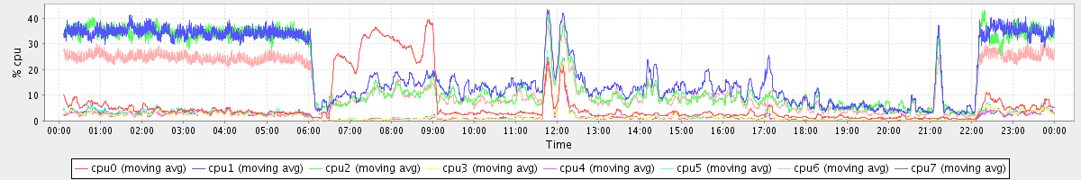 avg(cpu0) = 6.22 avg(cpu1) = 19.42 avg(cpu2) = 17.59 avg(cpu3) = 1.87 avg(cpu4) = 1.75 avg(cpu5) = 2.12 avg(cpu6) = 13.81 avg(cpu7) = 2.00