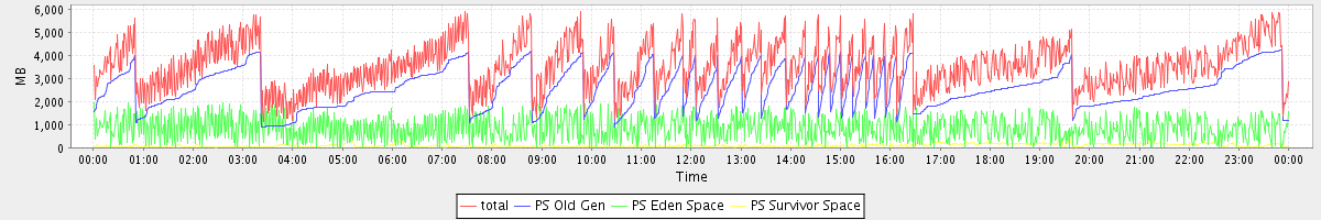 avg(total) = 3550.83 avg(PS Old Gen) = 2589.56 avg(PS Eden Space) = 862.58 avg(PS Survivor Space) = 98.69