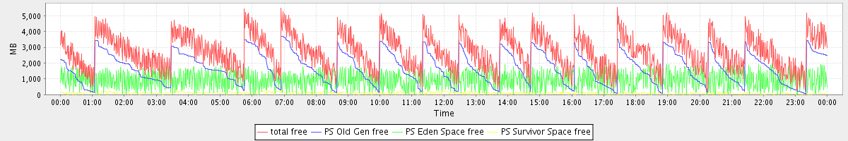 avg(total free) = 2733.76 avg(PS Old Gen free) = 1698.08 avg(PS Eden Space free) = 936.74 avg(PS Survivor Space free) = 98.94