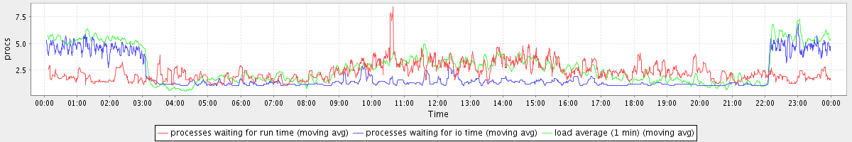 avg(processes waiting for run time) = 1.56 avg(processes waiting for io time) = 1.34 avg(load average (1 min)) = 2.85