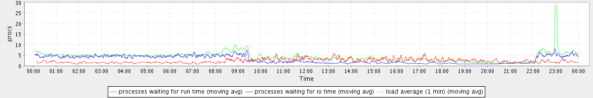 avg(processes waiting for run time) = 1.52 avg(processes waiting for io time) = 2.59 avg(load average (1 min)) = 4.31
