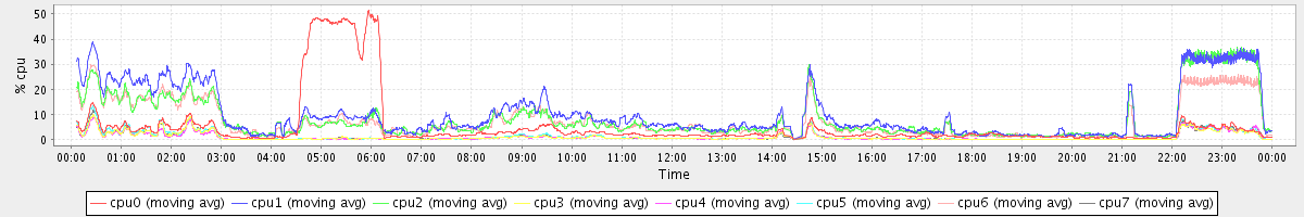 avg(cpu0) = 17.16 avg(cpu1) = 6.68 avg(cpu2) = 5.99 avg(cpu3) = 5.05 avg(cpu4) = 3.66 avg(cpu5) = 4.39 avg(cpu6) = 5.70 avg(cpu7) = 4.99