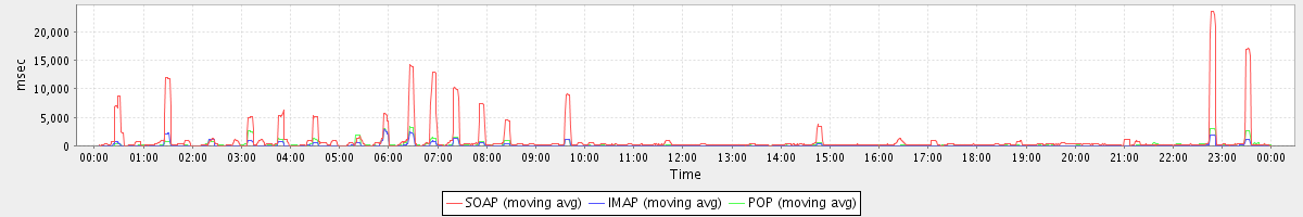 avg(SetAppointmentRequest) = 7266.38 avg(GetFolderRequest) = 6981.03 avg(SendMsgRequest) = 5928.87 avg(SearchGalRequest) = 9887.38 avg(SyncGalRequest) = 138588.89 avg(BackupRequest) = 228580.00 avg(SaveDraftRequest) = 6072.73 avg(CreateAppointmentRequest) = 6562.47 avg(CancelAppointmentRequest) = 37251.23 avg(AddMsgRequest) = 6124.70