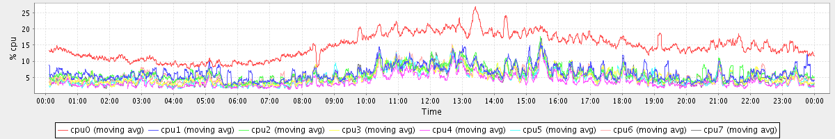 avg(cpu0) = 14.57 avg(cpu1) = 6.44 avg(cpu2) = 6.00 avg(cpu3) = 5.30 avg(cpu4) = 3.86 avg(cpu5) = 4.90 avg(cpu6) = 5.71 avg(cpu7) = 5.03