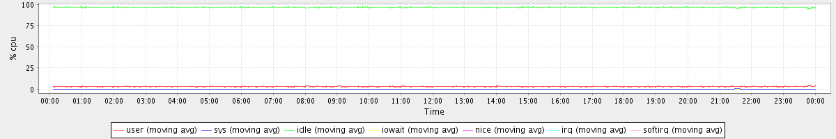 avg(user) = 3.12 avg(sys) = 0.20 avg(idle) = 96.62 avg(iowait) = 0.03 avg(nice) = 0.00 avg(irq) = 0.00 avg(softirq) = 0.00