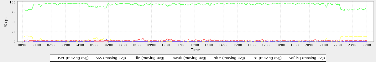 avg(user) = 3.31 avg(sys) = 0.72 avg(idle) = 93.48 avg(iowait) = 2.42 avg(nice) = 0.00 avg(irq) = 0.00 avg(softirq) = 0.05