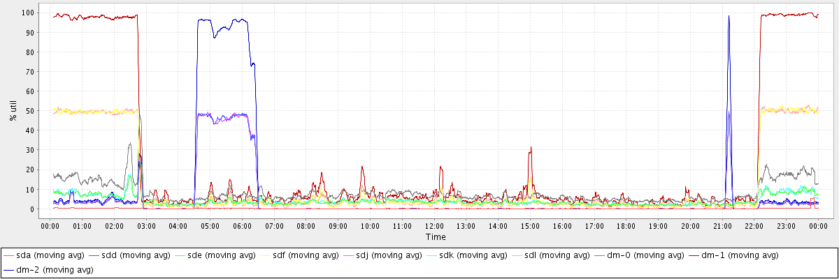 avg(sda) = 0.15 avg(sdd) = 4.59 avg(sde) = 4.02 avg(sdf) = 11.83 avg(sdj) = 4.57 avg(sdk) = 4.06 avg(sdl) = 11.80 avg(dm-0) = 8.09 avg(dm-1) = 23.33 avg(dm-2) = 8.65