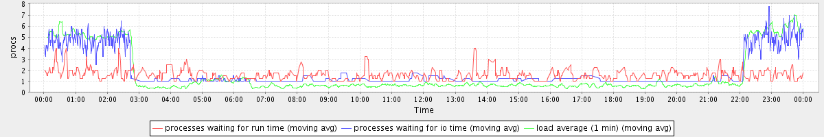 avg(processes waiting for run time) = 0.51 avg(processes waiting for io time) = 1.06 avg(load average (1 min)) = 1.57