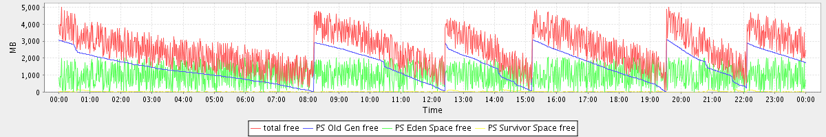 avg(total free) = 2568.59 avg(PS Old Gen free) = 1530.90 avg(PS Eden Space free) = 1012.07 avg(PS Survivor Space free) = 25.61