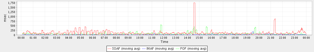 max(GetMsgRequest) = 16.00 max(MsgActionRequest.move) = 29.00 max(SearchConvRequest) = 36.00 max(SearchRequest) = 57.00 max(GetFolderRequest) = 225.00 max(MsgActionRequest.delete) = 83.00 max(NoOpRequest) = 31.00 max(SyncRequest) = 15.00 max(ConvActionRequest.trash) = 22.00 max(MsgActionRequest.update) = 19.00
