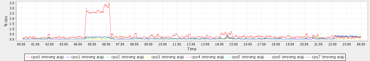 avg(cpu0) = 0.41 avg(cpu1) = 0.07 avg(cpu2) = 0.06 avg(cpu3) = 0.02 avg(cpu4) = 0.01 avg(cpu5) = 0.01 avg(cpu6) = 0.04 avg(cpu7) = 0.02