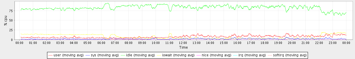 avg(user) = 7.46 avg(sys) = 1.94 avg(idle) = 82.91 avg(iowait) = 7.44 avg(nice) = 0.00 avg(irq) = 0.02 avg(softirq) = 0.23