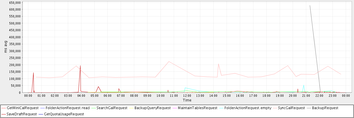 avg(GetMiniCalRequest) = 1344.58 avg(FolderActionRequest.read) = 2768.00 avg(SearchGalRequest) = 4112.08 avg(BackupQueryRequest) = 1045.09 avg(MaintainTablesRequest) = 350393.00 avg(FolderActionRequest.empty) = 4987.33 avg(SyncGalRequest) = 133183.62 avg(BackupRequest) = 314078.50 avg(SaveDraftRequest) = 936.08 avg(GetQuotaUsageRequest) = 2407.00