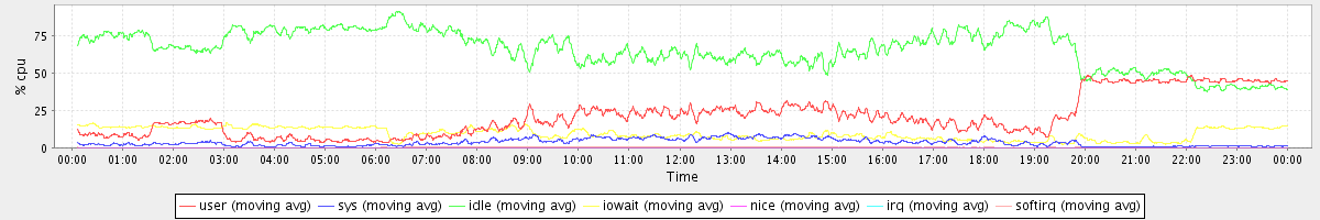 avg(user) = 20.77 avg(sys) = 3.54 avg(idle) = 65.94 avg(iowait) = 9.39 avg(nice) = 0.00 avg(irq) = 0.03 avg(softirq) = 0.32