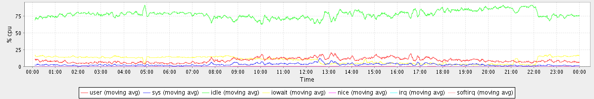 avg(user) = 9.19 avg(sys) = 2.75 avg(idle) = 78.00 avg(iowait) = 9.74 avg(nice) = 0.00 avg(irq) = 0.02 avg(softirq) = 0.29