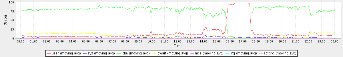 avg(user) = 15.53 avg(sys) = 2.02 avg(idle) = 74.36 avg(iowait) = 7.83 avg(nice) = 0.00 avg(irq) = 0.02 avg(softirq) = 0.23