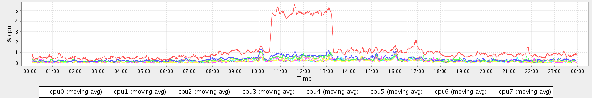 avg(cpu0) = 1.23 avg(cpu1) = 0.36 avg(cpu2) = 0.30 avg(cpu3) = 0.15 avg(cpu4) = 0.15 avg(cpu5) = 0.15 avg(cpu6) = 0.26 avg(cpu7) = 0.15