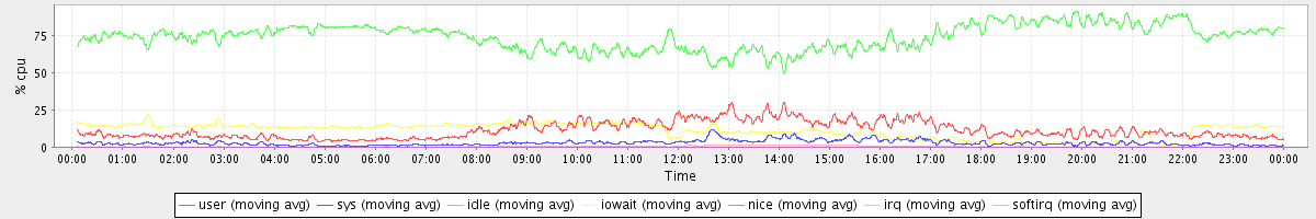 avg(user) = 11.40 avg(sys) = 2.83 avg(idle) = 74.23 avg(iowait) = 11.12 avg(nice) = 0.00 avg(irq) = 0.04 avg(softirq) = 0.37