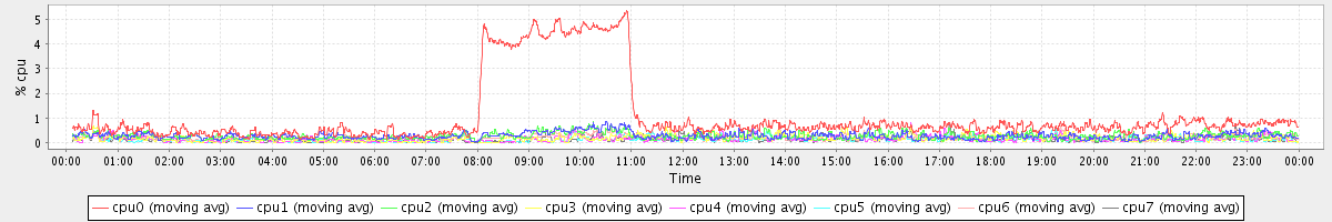 avg(cpu0) = 1.05 avg(cpu1) = 0.27 avg(cpu2) = 0.27 avg(cpu3) = 0.17 avg(cpu4) = 0.15 avg(cpu5) = 0.14 avg(cpu6) = 0.19 avg(cpu7) = 0.13