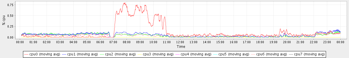 avg(cpu0) = 1.19 avg(cpu1) = 0.16 avg(cpu2) = 0.15 avg(cpu3) = 0.04 avg(cpu4) = 0.03 avg(cpu5) = 0.03 avg(cpu6) = 0.11 avg(cpu7) = 0.04