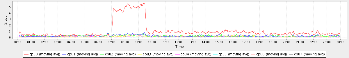 avg(cpu0) = 1.04 avg(cpu1) = 0.22 avg(cpu2) = 0.21 avg(cpu3) = 0.07 avg(cpu4) = 0.05 avg(cpu5) = 0.04 avg(cpu6) = 0.16 avg(cpu7) = 0.06