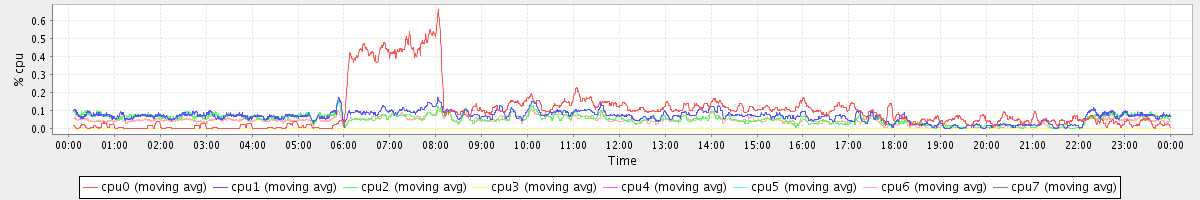 avg(cpu0) = 1.08 avg(cpu1) = 0.31 avg(cpu2) = 0.27 avg(cpu3) = 0.14 avg(cpu4) = 0.13 avg(cpu5) = 0.14 avg(cpu6) = 0.24 avg(cpu7) = 0.14