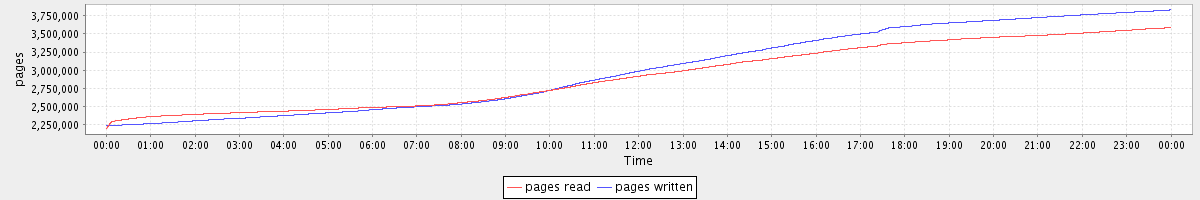 avg(pages read) = 2924901.97 avg(pages written) = 3004289.46