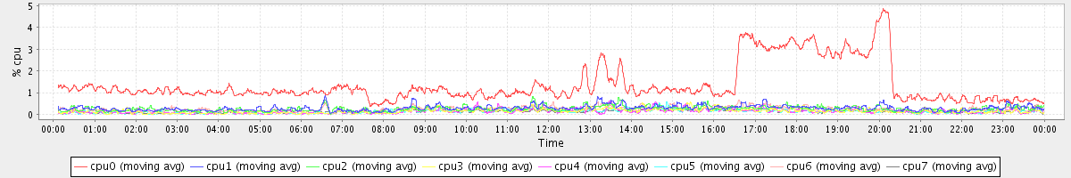 avg(cpu0) = 1.37 avg(cpu1) = 0.29 avg(cpu2) = 0.25 avg(cpu3) = 0.15 avg(cpu4) = 0.14 avg(cpu5) = 0.13 avg(cpu6) = 0.23 avg(cpu7) = 0.13
