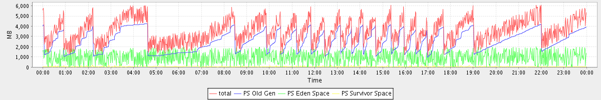 avg(total) = 3522.56 avg(PS Old Gen) = 2525.29 avg(PS Eden Space) = 953.11 avg(PS Survivor Space) = 44.16