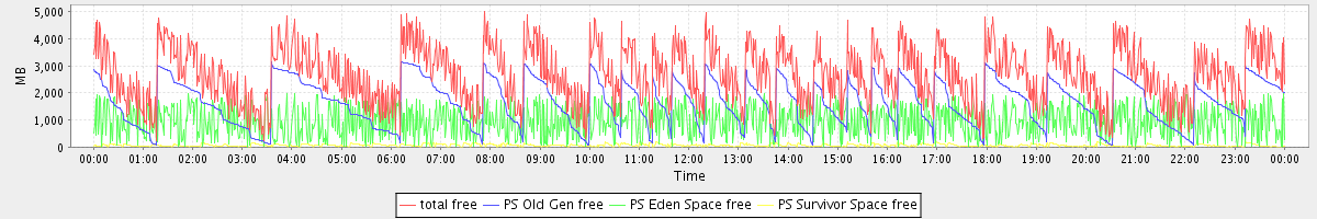 avg(total free) = 2690.07 avg(PS Old Gen free) = 1654.32 avg(PS Eden Space free) = 969.86 avg(PS Survivor Space free) = 65.88