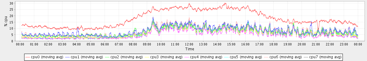 avg(cpu0) = 1.23 avg(cpu1) = 0.32 avg(cpu2) = 0.29 avg(cpu3) = 0.15 avg(cpu4) = 0.13 avg(cpu5) = 0.15 avg(cpu6) = 0.25 avg(cpu7) = 0.15