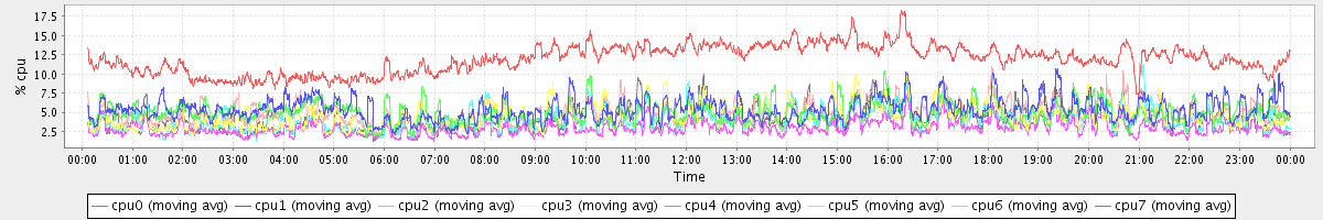 avg(cpu0) = 7.08 avg(cpu1) = 15.10 avg(cpu2) = 14.57 avg(cpu3) = 1.15 avg(cpu4) = 1.22 avg(cpu5) = 1.30 avg(cpu6) = 10.54 avg(cpu7) = 1.38