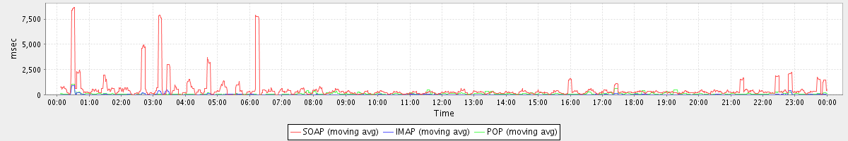 avg(SendMsgRequest) = 1473.89 avg(ConvActionRequest.delete) = 2003.26 avg(SearchGalRequest) = 3400.24 avg(FolderActionRequest.empty) = 5280.14 avg(SyncGalRequest) = 103432.00 avg(ConvActionRequest.spam) = 1277.00 avg(BackupRequest) = 355940.50 avg(SaveDraftRequest) = 1701.60 avg(ExportMailboxRequest) = 683539.00 avg(GetQuotaUsageRequest) = 2479.00