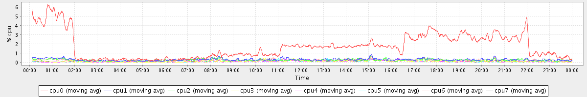 avg(cpu0) = 1.70 avg(cpu1) = 0.28 avg(cpu2) = 0.24 avg(cpu3) = 0.11 avg(cpu4) = 0.10 avg(cpu5) = 0.10 avg(cpu6) = 0.21 avg(cpu7) = 0.10