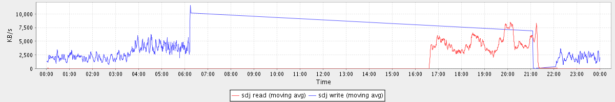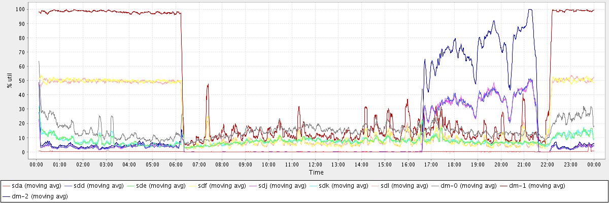 avg(sda) = 0.17 avg(sdd) = 8.73 avg(sde) = 7.70 avg(sdf) = 21.68 avg(sdj) = 8.68 avg(sdk) = 7.74 avg(sdl) = 21.47 avg(dm-0) = 15.44 avg(dm-1) = 42.54 avg(dm-2) = 16.62