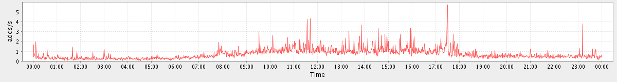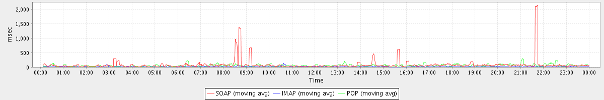 max(GetMsgRequest) = 28.00 max(MsgActionRequest.move) = 34.00 max(SearchConvRequest) = 66.00 max(GetFolderRequest) = 737.00 max(SearchRequest) = 649.00 max(GetContactsRequest) = 134.00 max(MsgActionRequest.delete) = 64.00 max(NoOpRequest) = 37.00 max(ConvActionRequest.trash) = 39.00 max(GetAppointmentRequest) = 157.00