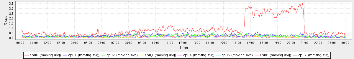 avg(cpu0) = 0.96 avg(cpu1) = 0.22 avg(cpu2) = 0.21 avg(cpu3) = 0.10 avg(cpu4) = 0.08 avg(cpu5) = 0.08 avg(cpu6) = 0.16 avg(cpu7) = 0.08
