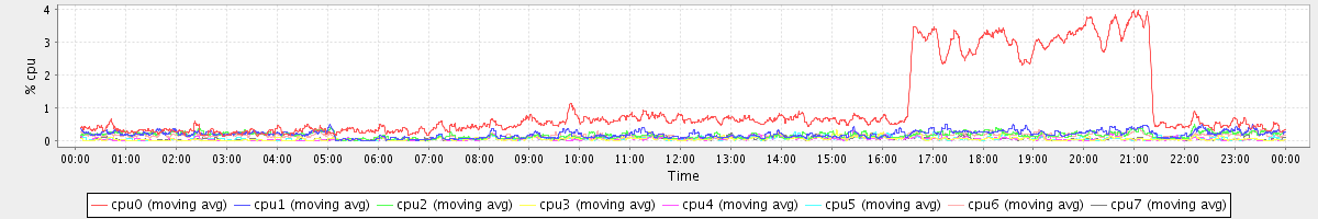 avg(cpu0) = 1.01 avg(cpu1) = 0.20 avg(cpu2) = 0.17 avg(cpu3) = 0.05 avg(cpu4) = 0.05 avg(cpu5) = 0.05 avg(cpu6) = 0.14 avg(cpu7) = 0.06