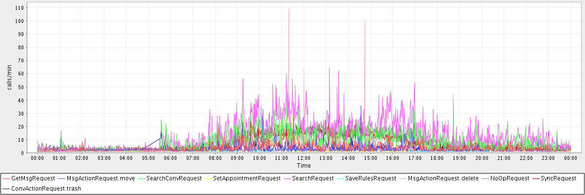max(GetMsgRequest) = 20.00 max(MsgActionRequest.move) = 36.00 max(SearchConvRequest) = 44.00 max(SetAppointmentRequest) = 29.00 max(SearchRequest) = 64.00 max(SaveRulesRequest) = 21.00 max(MsgActionRequest.delete) = 109.00 max(NoOpRequest) = 26.00 max(SyncRequest) = 25.00 max(ConvActionRequest.trash) = 40.00