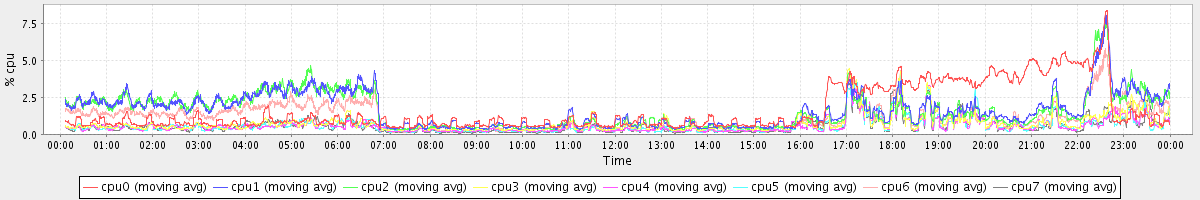 avg(cpu0) = 1.64 avg(cpu1) = 1.64 avg(cpu2) = 1.57 avg(cpu3) = 0.74 avg(cpu4) = 0.58 avg(cpu5) = 0.60 avg(cpu6) = 1.14 avg(cpu7) = 0.58