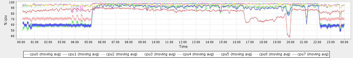 avg(cpu0) = 1.21 avg(cpu1) = 0.97 avg(cpu2) = 0.88 avg(cpu3) = 0.39 avg(cpu4) = 0.30 avg(cpu5) = 0.26 avg(cpu6) = 0.59 avg(cpu7) = 0.22