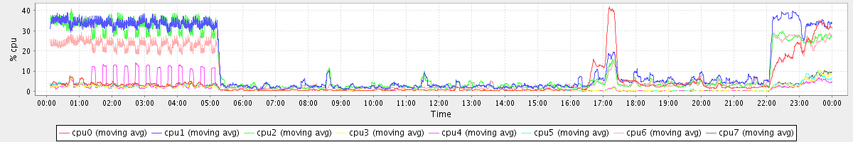 avg(cpu0) = 4.25 avg(cpu1) = 12.71 avg(cpu2) = 11.39 avg(cpu3) = 1.04 avg(cpu4) = 1.44 avg(cpu5) = 1.15 avg(cpu6) = 8.72 avg(cpu7) = 1.20