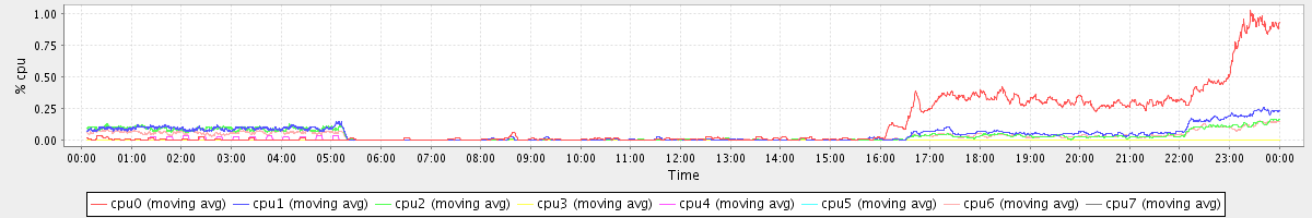avg(cpu0) = 1.20 avg(cpu1) = 0.14 avg(cpu2) = 0.12 avg(cpu3) = 0.04 avg(cpu4) = 0.03 avg(cpu5) = 0.04 avg(cpu6) = 0.10 avg(cpu7) = 0.04