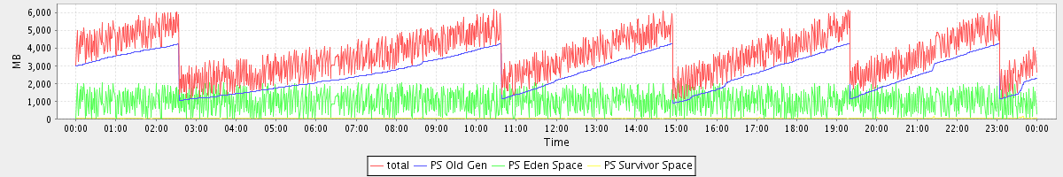 avg(total) = 3663.64 avg(PS Old Gen) = 2638.13 avg(PS Eden Space) = 991.65 avg(PS Survivor Space) = 33.87