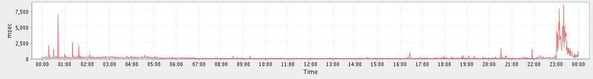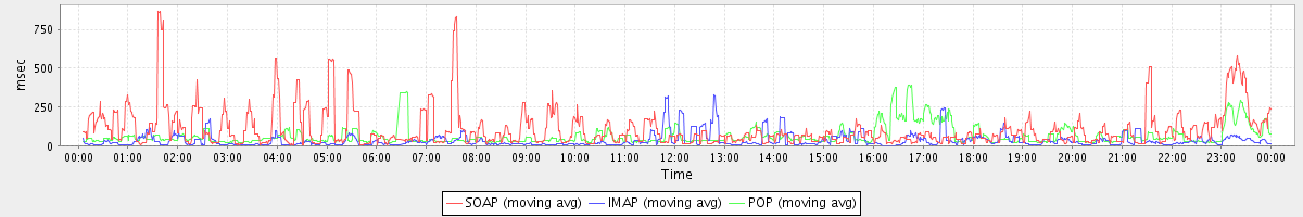 max(GetMsgRequest) = 24.00 max(MsgActionRequest.move) = 22.00 max(SearchConvRequest) = 24.00 max(SearchRequest) = 29.00 max(GetFolderRequest) = 293.00 max(NoOpRequest) = 27.00 max(SyncRequest) = 11.00 max(GetInfoRequest) = 13.00 max(ConvActionRequest.trash) = 14.00 max(AuthRequest) = 12.00