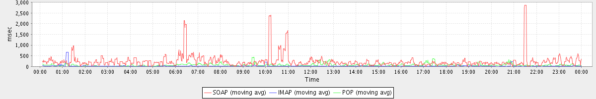 max(GetMsgRequest) = 235.00 max(MsgActionRequest.move) = 572.00 max(SearchConvRequest) = 37.00 max(GetFolderRequest) = 308.00 max(SearchRequest) = 49.00 max(MsgActionRequest.delete) = 157.00 max(NoOpRequest) = 33.00 max(SyncRequest) = 20.00 max(ConvActionRequest.trash) = 32.00 max(GetAppointmentRequest) = 173.00