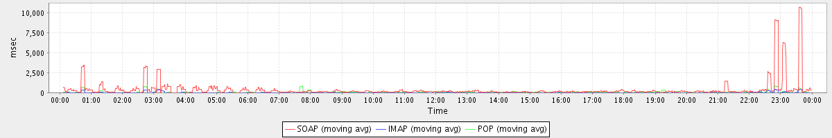 max(GetMsgRequest) = 29.00 max(MsgActionRequest.move) = 28.00 max(SearchConvRequest) = 34.00 max(SearchRequest) = 292.00 max(AutoCompleteGalRequest) = 11.00 max(NoOpRequest) = 26.00 max(SyncRequest) = 11.00 max(GetInfoRequest) = 14.00 max(ConvActionRequest.trash) = 20.00 max(AuthRequest) = 14.00