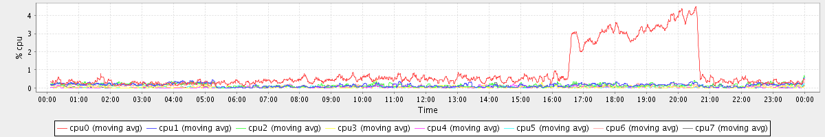 avg(cpu0) = 0.07 avg(cpu1) = 0.05 avg(cpu2) = 0.04 avg(cpu3) = 0.00 avg(cpu4) = 0.00 avg(cpu5) = 0.00 avg(cpu6) = 0.03 avg(cpu7) = 0.00