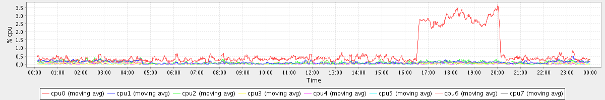 avg(cpu0) = 0.69 avg(cpu1) = 0.11 avg(cpu2) = 0.11 avg(cpu3) = 0.04 avg(cpu4) = 0.03 avg(cpu5) = 0.03 avg(cpu6) = 0.07 avg(cpu7) = 0.03